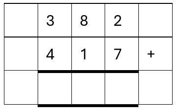 The 2 and the 7 represent the Ones and should appear in the same column together. 8 and 1 represent the Tens and should appear in the same column together. Finally, 3 and 4 represent the Hundreds – they too must appear in the same column together.