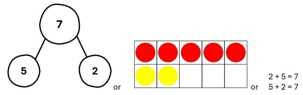 For example, one number bond to 7 is 5 + 2. This means that when a group of 5 is combined with a group of 2, it results in a larger group of 7.