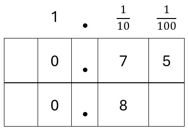 Then, compare the digits place by place. For instance, comparing 0.75 and 0.8 involves noting the 8 in the tenths place is more than 7, making 0.8 the larger number.