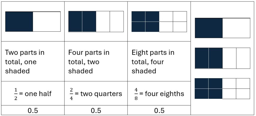 Moving forward, it is important that learners can calculate equivalent fractions. It’s not just about being able to recognise pictorial or concrete representations.