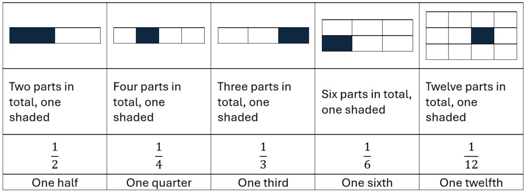 The simplest fractions are unit fractions. These are fractions where the numerator is one. We are considering just one part out of the total number of equal parts. So, one half or one quarter, one third, one sixth, one twelfth and so on.