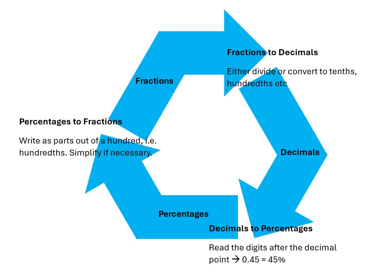 There are so many ways in to understanding the relationships between fractions, decimals and percentages that the topic merits a whole article on itself. It is sufficient to say that a good grasp of number will assist learners greatly in developing their own pathways to make those links.