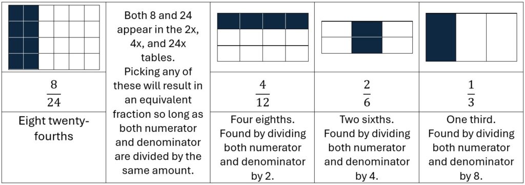If you punch the fractions into a calculator, e.g. 8 ÷ 24, they all give the same decimal value, i.e. 0.33333333… – after all they are equivalent, so they must have the same value.