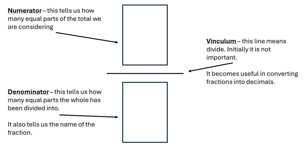 There are three parts to a traditional or ‘vulgar’ fraction. Two numbers and a line.